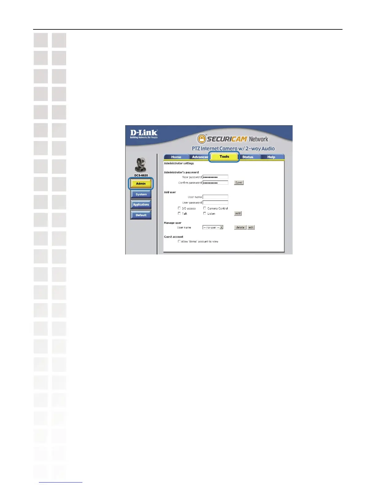 The DCS-6620 is manufactured without any passwords by default. This allows the ability to
