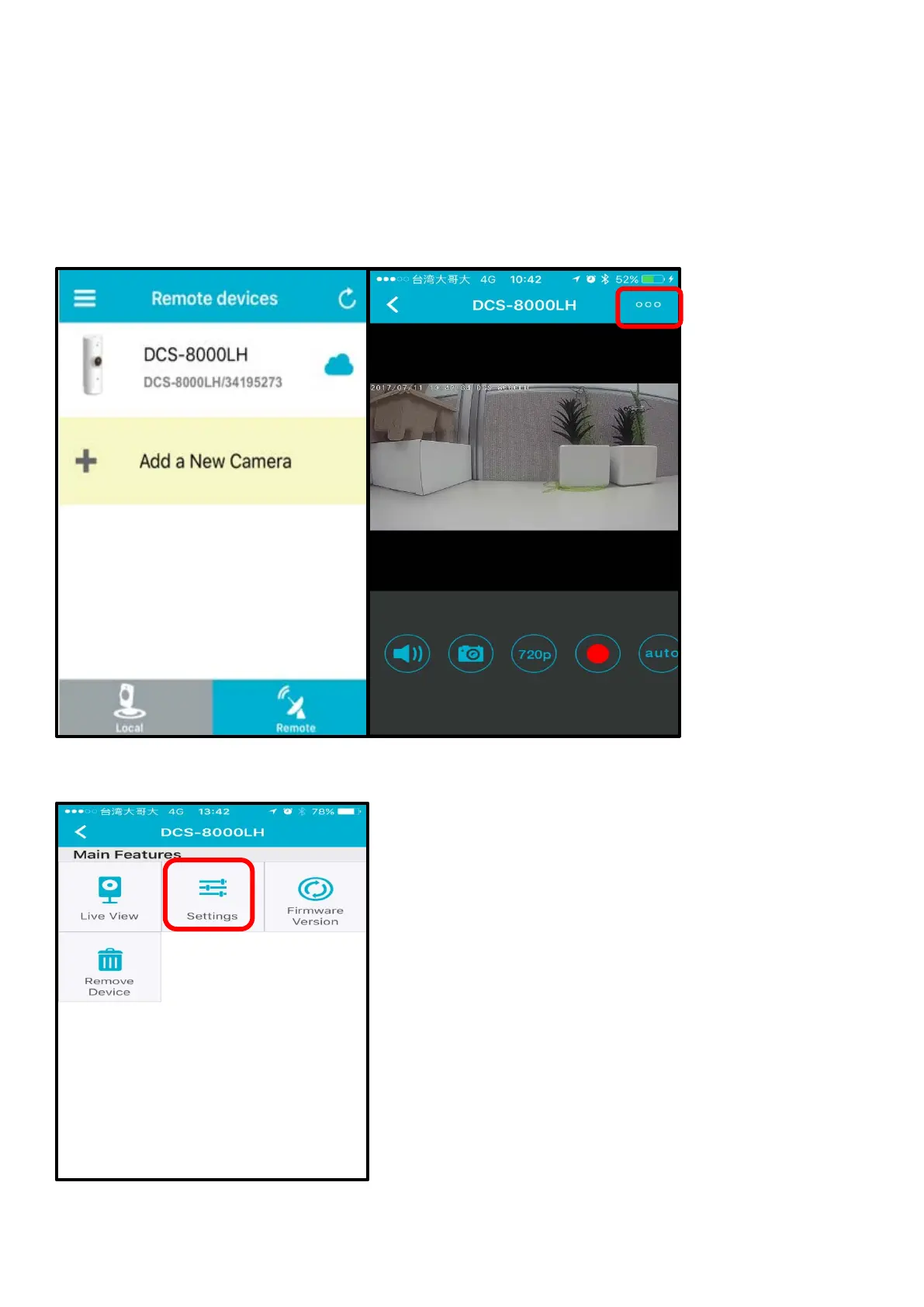 Step 1: Tap the DCS-8200LH camera. Then, tap the camera main feature icon in the top-right corner.