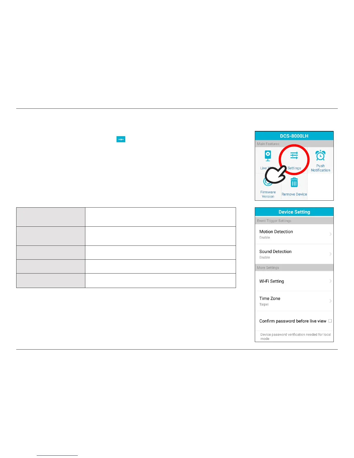 Settings to congure motion and sound detection and other camera settings.