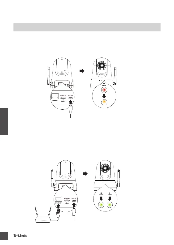 Sæt den medfølgende USB-spændingsadapter tilbage i kameraet. Vent til PWR LED skifter fra