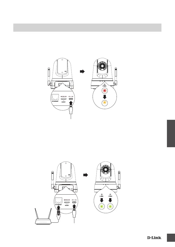 Kytke mukana toimitettu USB-virtasovitin kameran taakse. Odota, kunnes PWR-merkkivalo