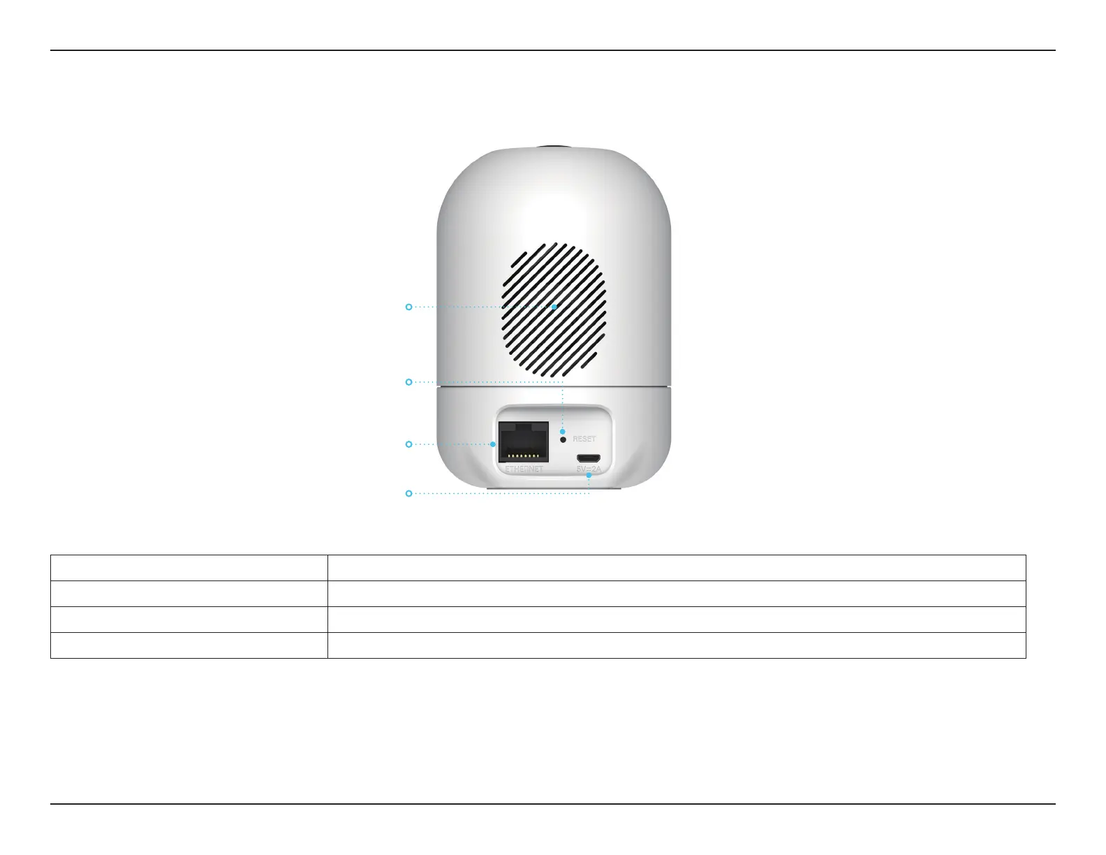 Reset Button Hold the recessed button down to reset the camera to factory default settings.