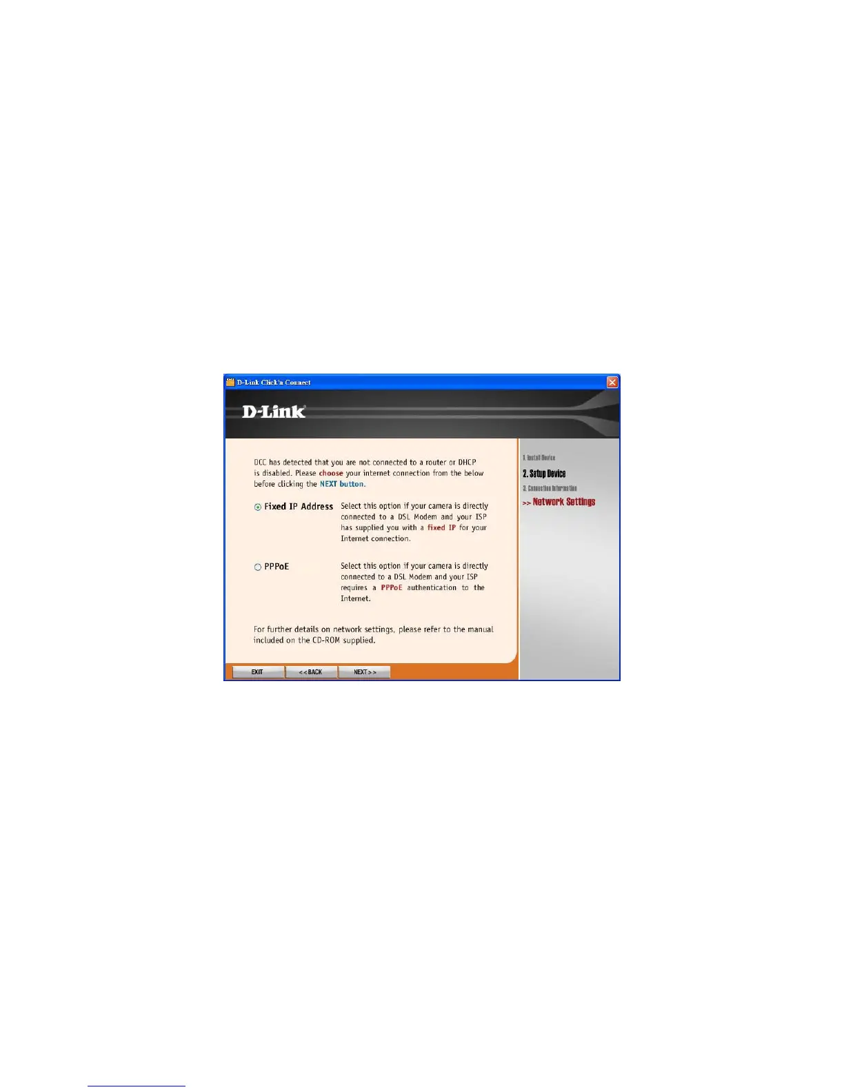 If DHCP is not available for your network and IP camera, the following screen will show up to allow you select Fixed IP Address or PPPoE for your Internet