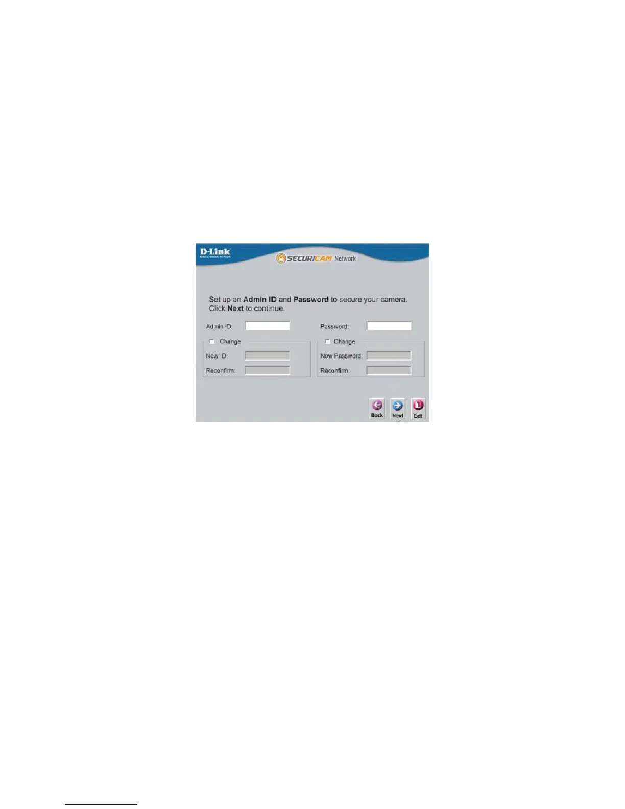 To change the Admin ID and Password, select both Change boxes and enter a New ID and New Password. Click Next.