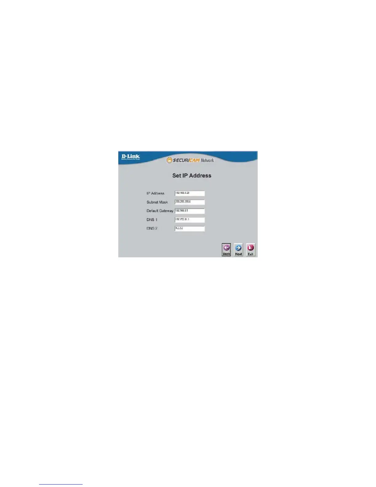 If you are connecting to a router, the Gateway and DNS 1 entries should be the IP address of your router. Click Next.