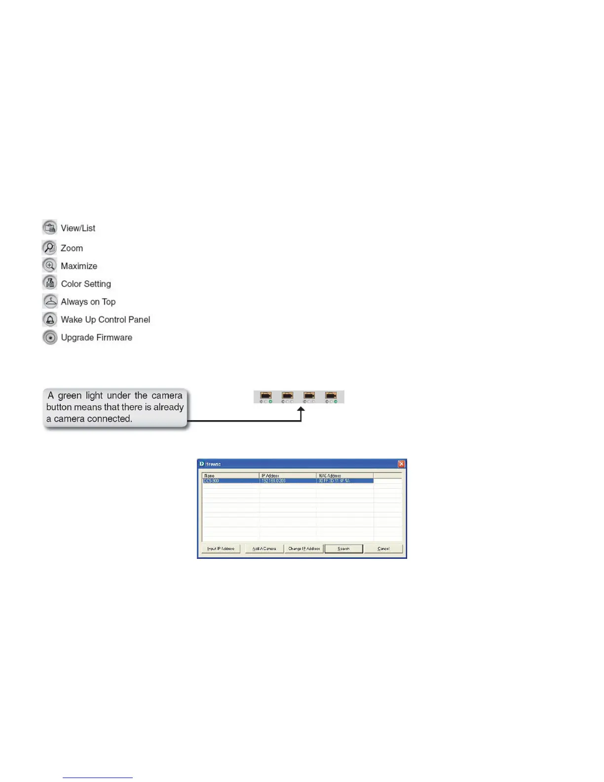 To add a new camera, select the Camera button from the IPView SE. Make sure that the green lights are on when clicking the camera button.