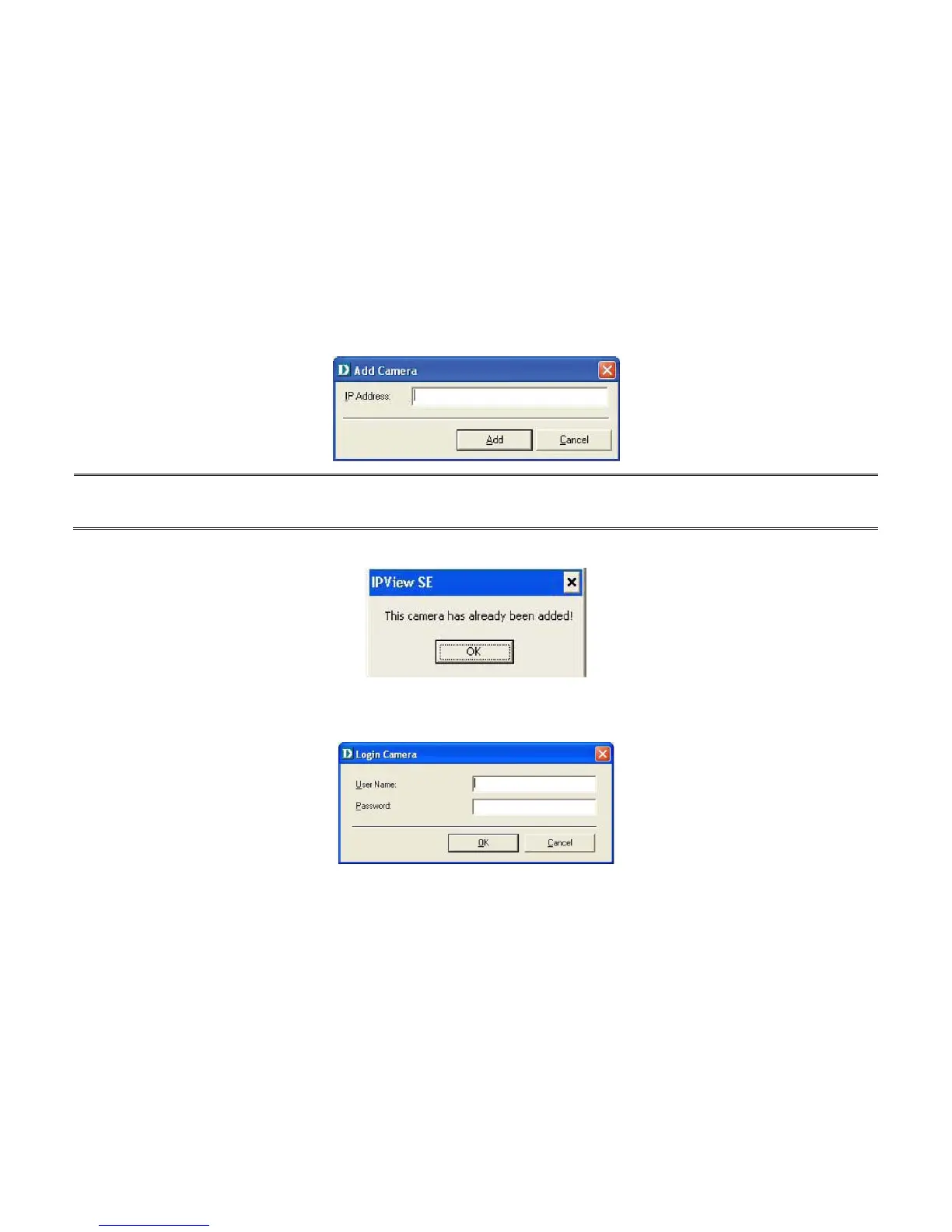 If the Login Camera dialog box appears, make sure to enter the correct User Name and Password. Click OK. The camera will be added into IPView SE. If the User