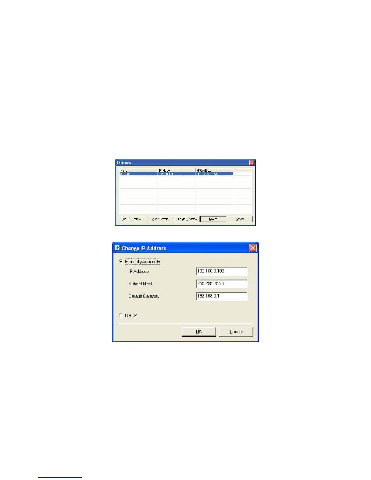 appear. Select Manually Assign IP if you want to connect manually to the camera by providing the IP Address, Subnet Mask, and Default Gateway. Select DHCP if you