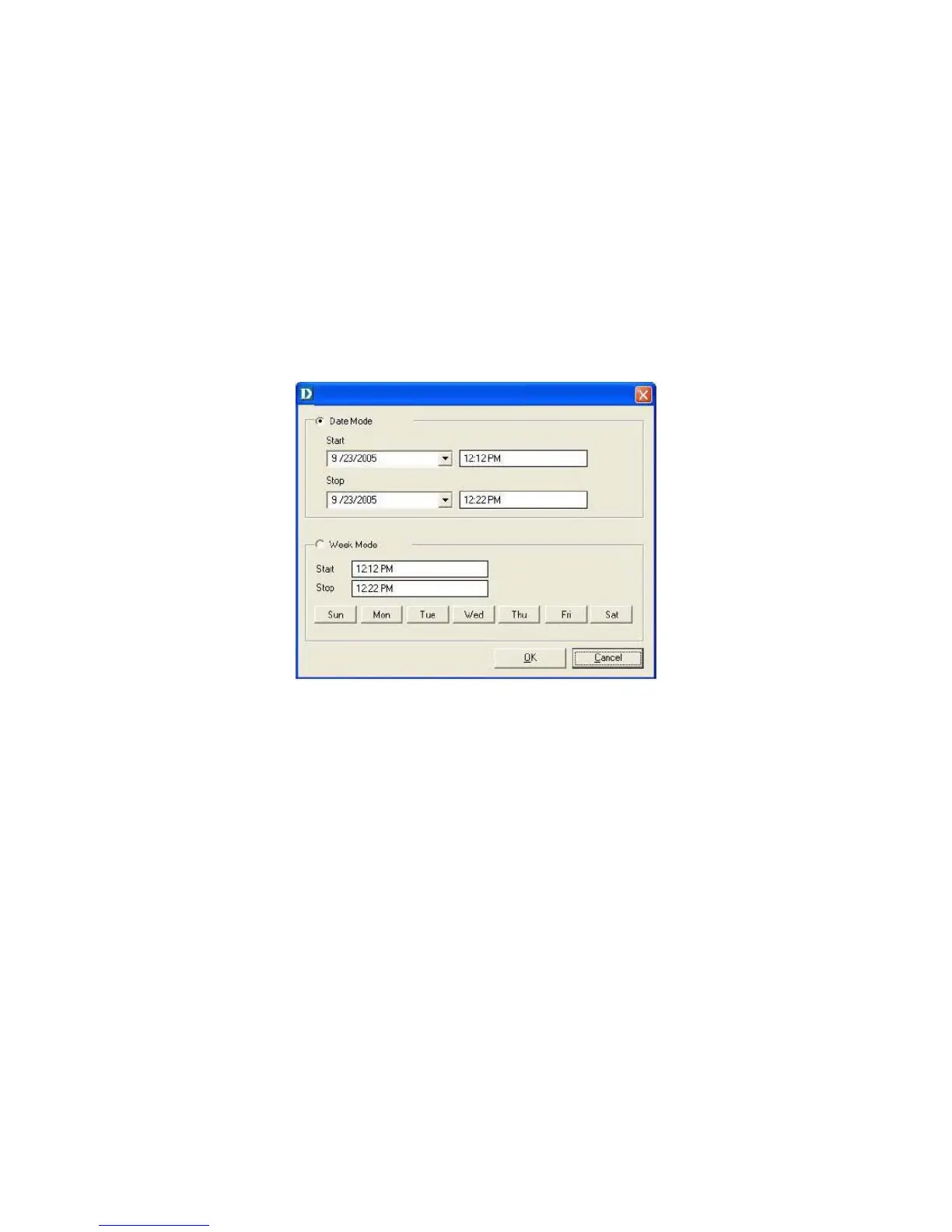 Select Date Mode and enter in the Start date/time, and Stop date/time. The camera will start to record according to the specified date and time period entered. Select