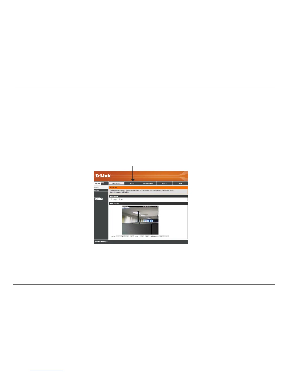 DCS-934L Live Video Page appears with a window displaying live video from the camera. You are able to view this screen from any PC running