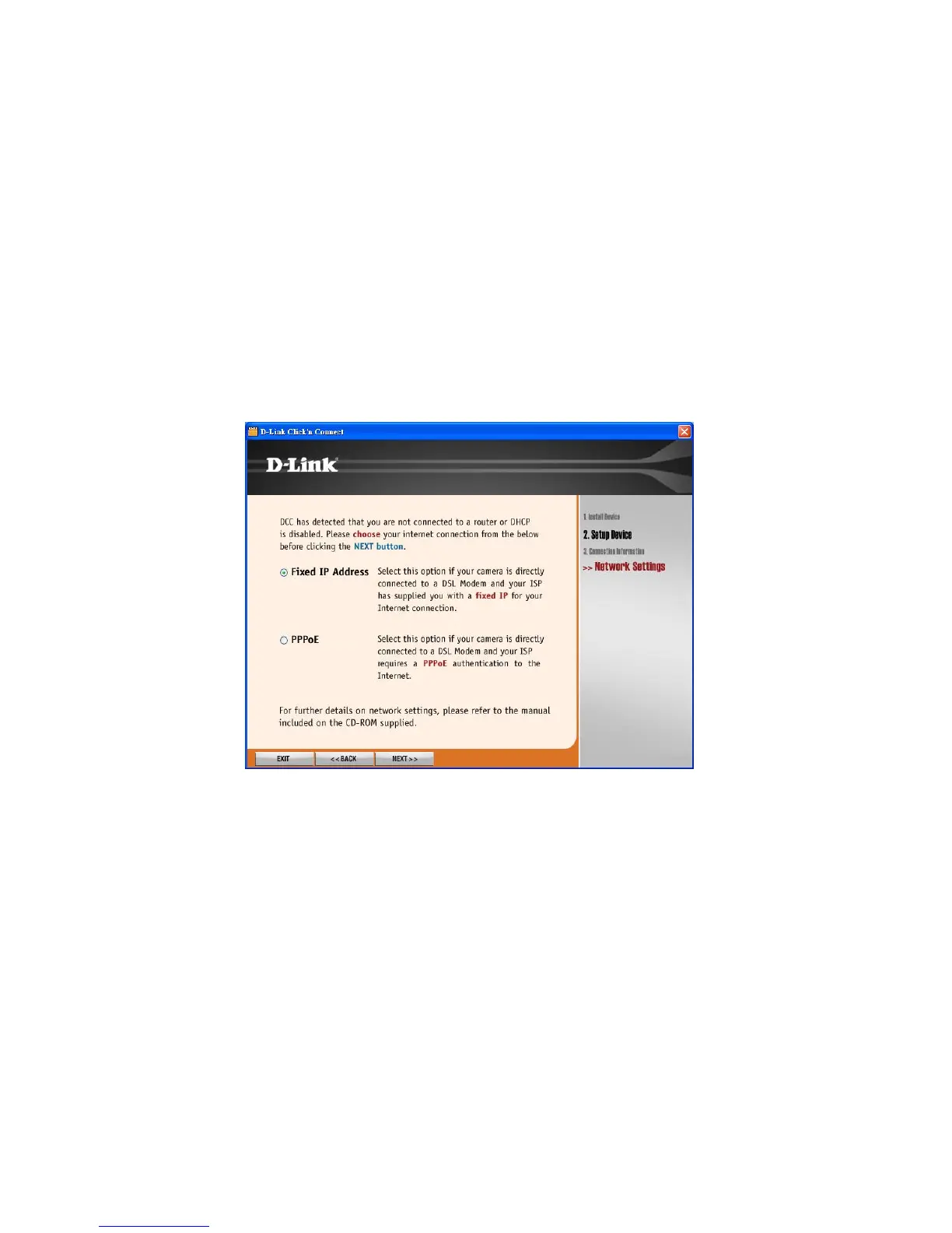 If DHCP is not available for your network and IP camera, the following screen will show up to allow you select Fixed IP Address or PPPoE for your Internet