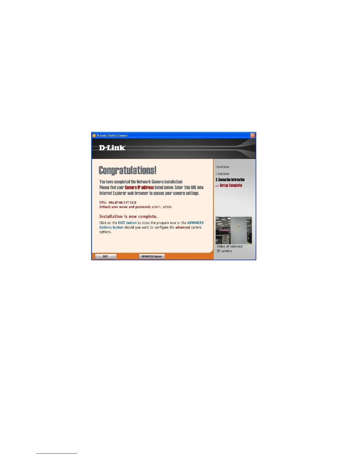 The installation is now complete. You may click ADVANCED Options to enter your IP camera’s Web Configuration or EXIT to leave the screen.
