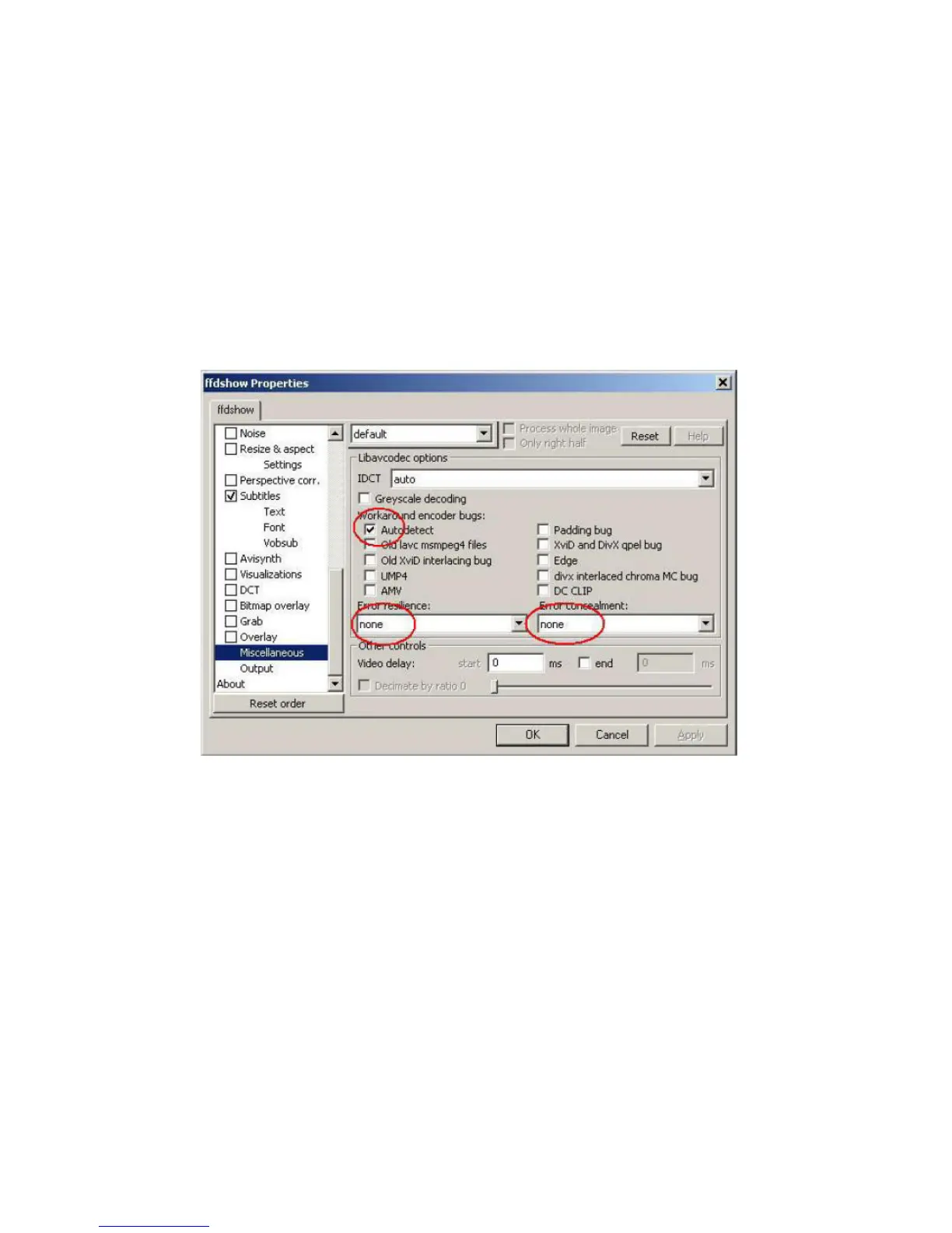 At the ffdshow properties window, scroll to the bottom and click Miscellaneous. Be sure that Autodetect is checked and that Error resilience and Error