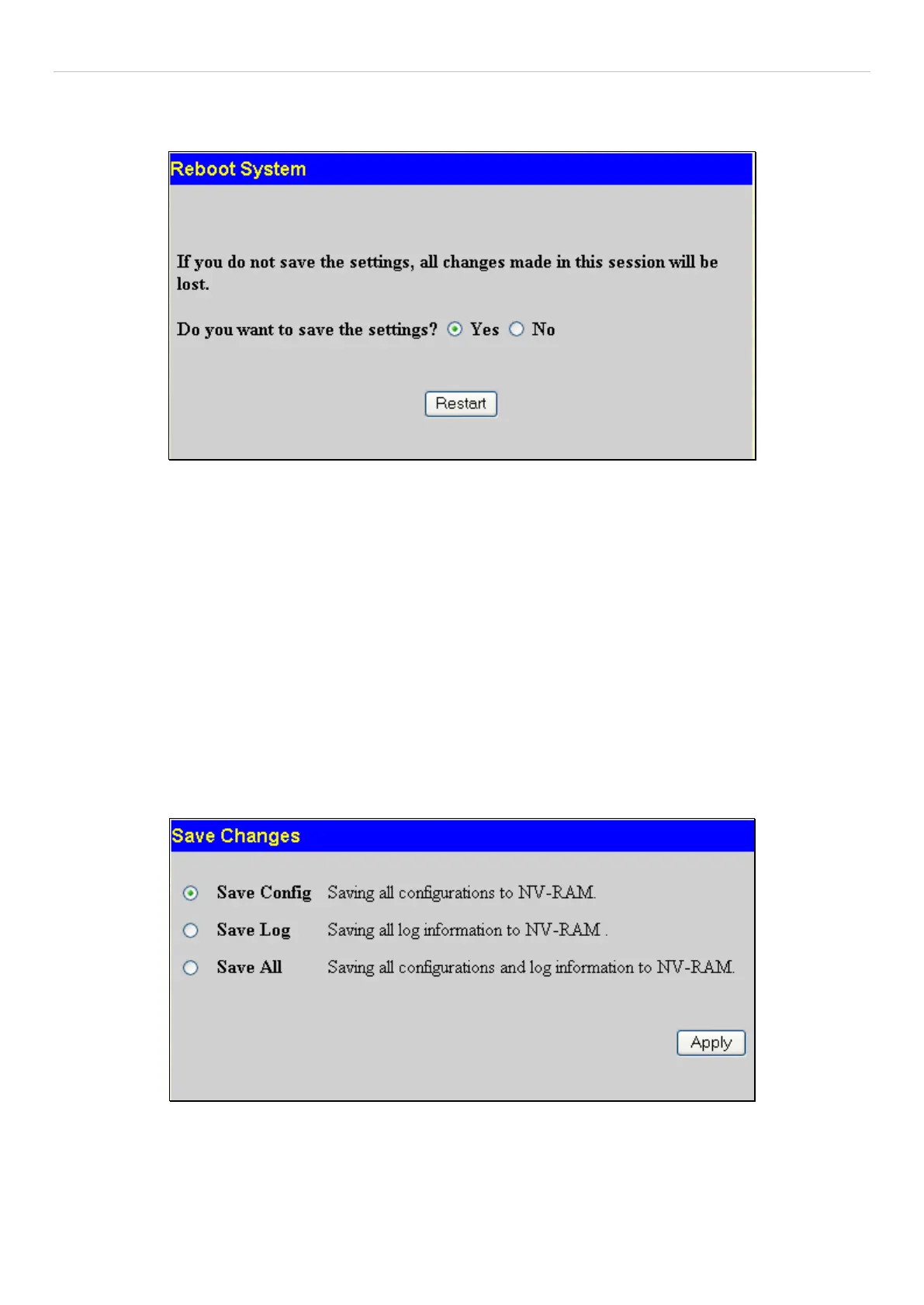 Clicking the Yes radio button will instruct the Switch to save the current configuration to non-volatile RAM before restarting the