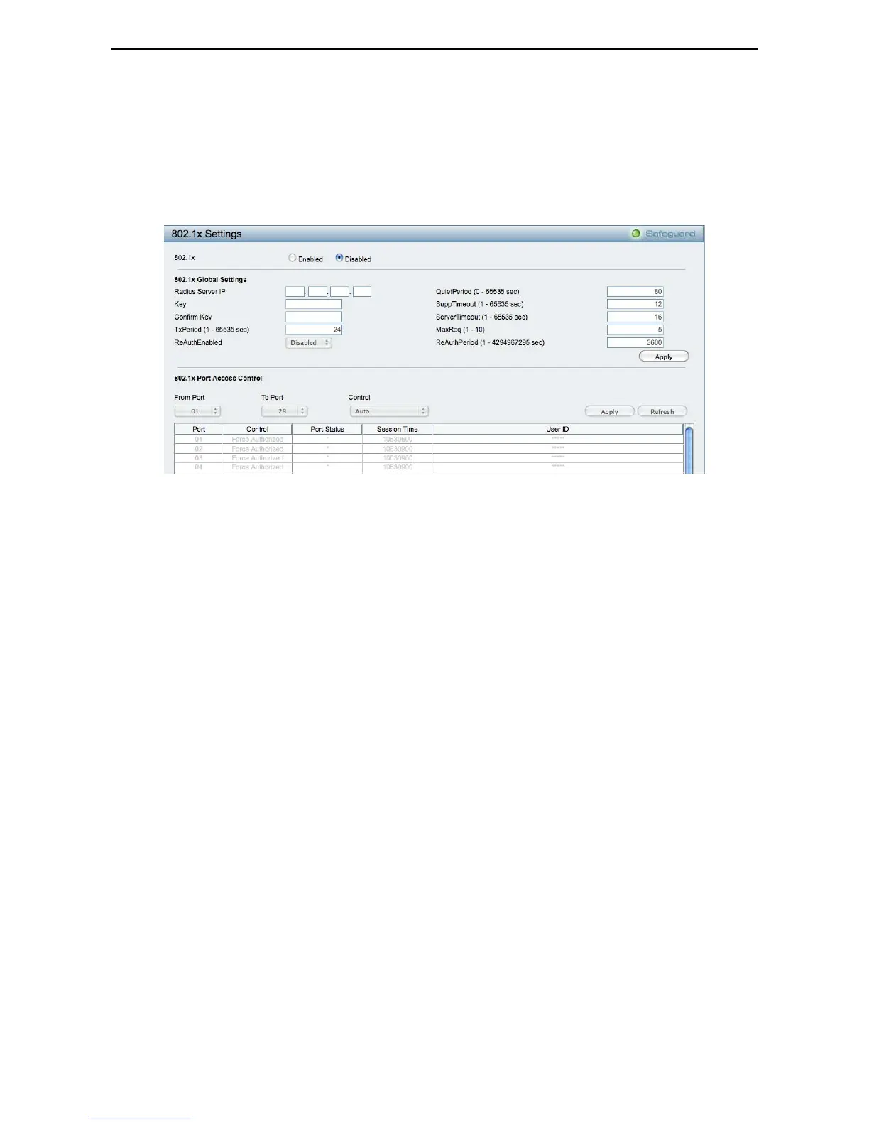 TxPeriod (1 – 65535 sec): This sets the TxPeriod of time for the authenticator PAE state machine. This