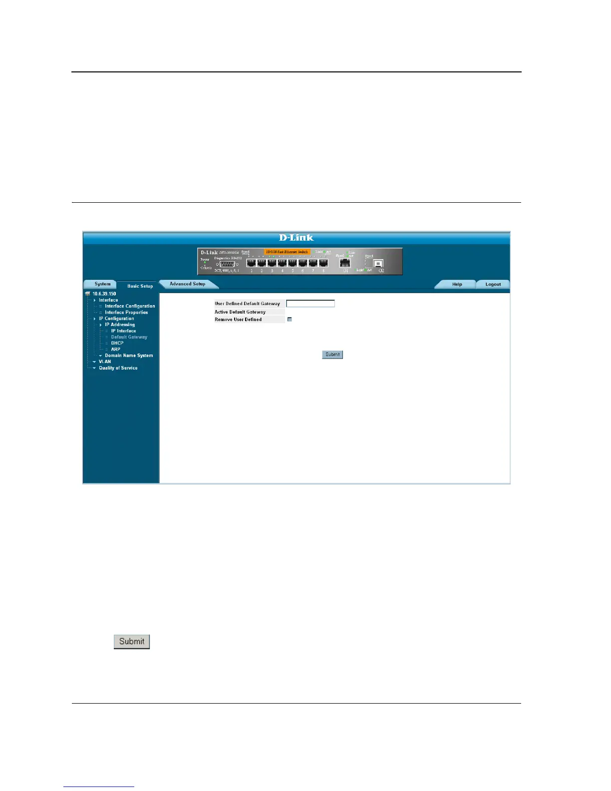 1. Click Basic Setup > IP Configuration > IP Addressing > Default Gateway. The Default Gateway Page