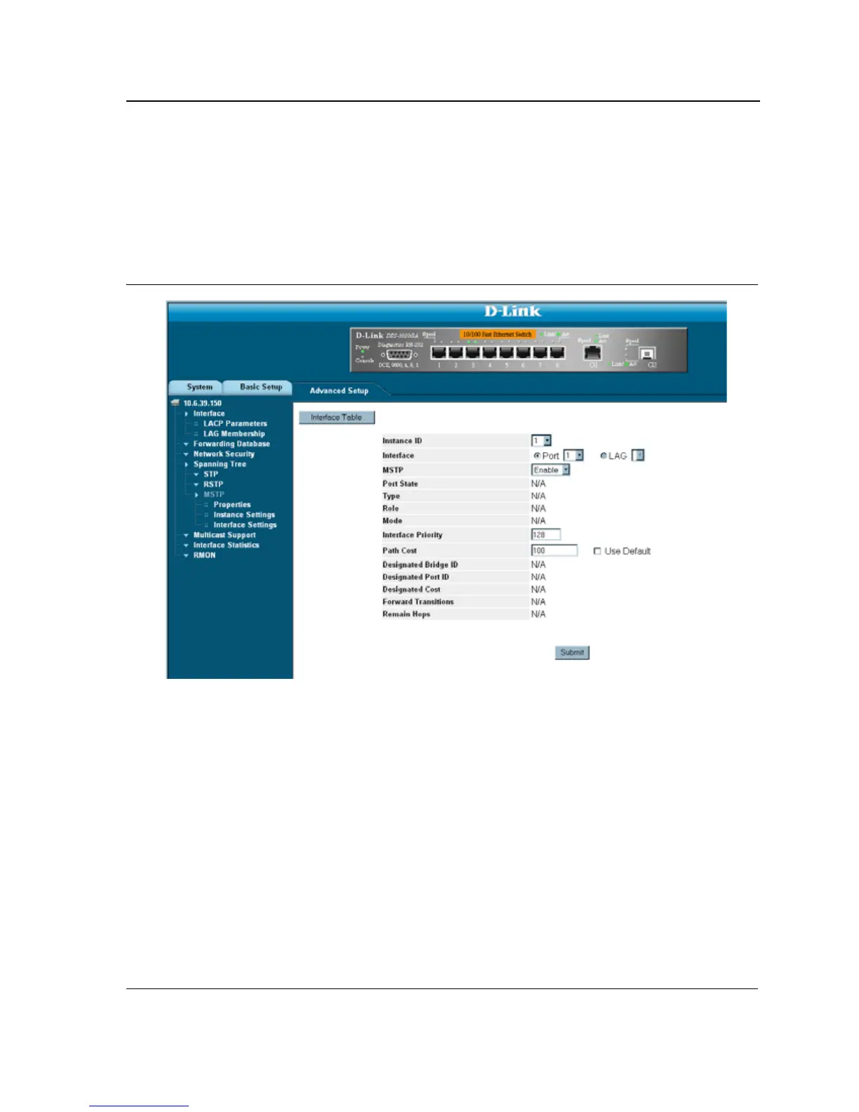 1. Click Advanced Setup > Spanning Tree > MSTP > Interface Settings. The MSTP Interface Settings Page