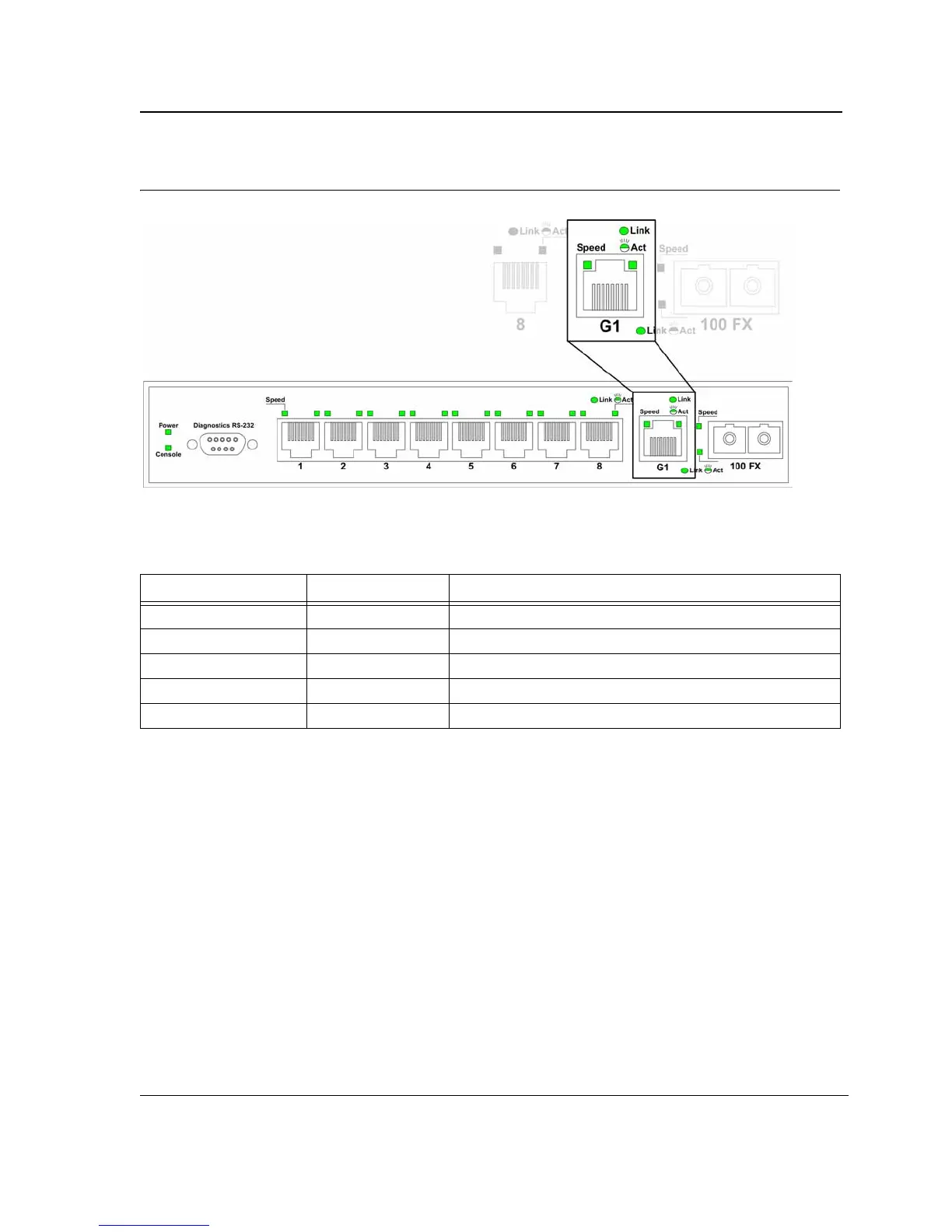 The RJ-45 ports have two LEDs, one for speed, and one for Link /activity. The LED indications are described in