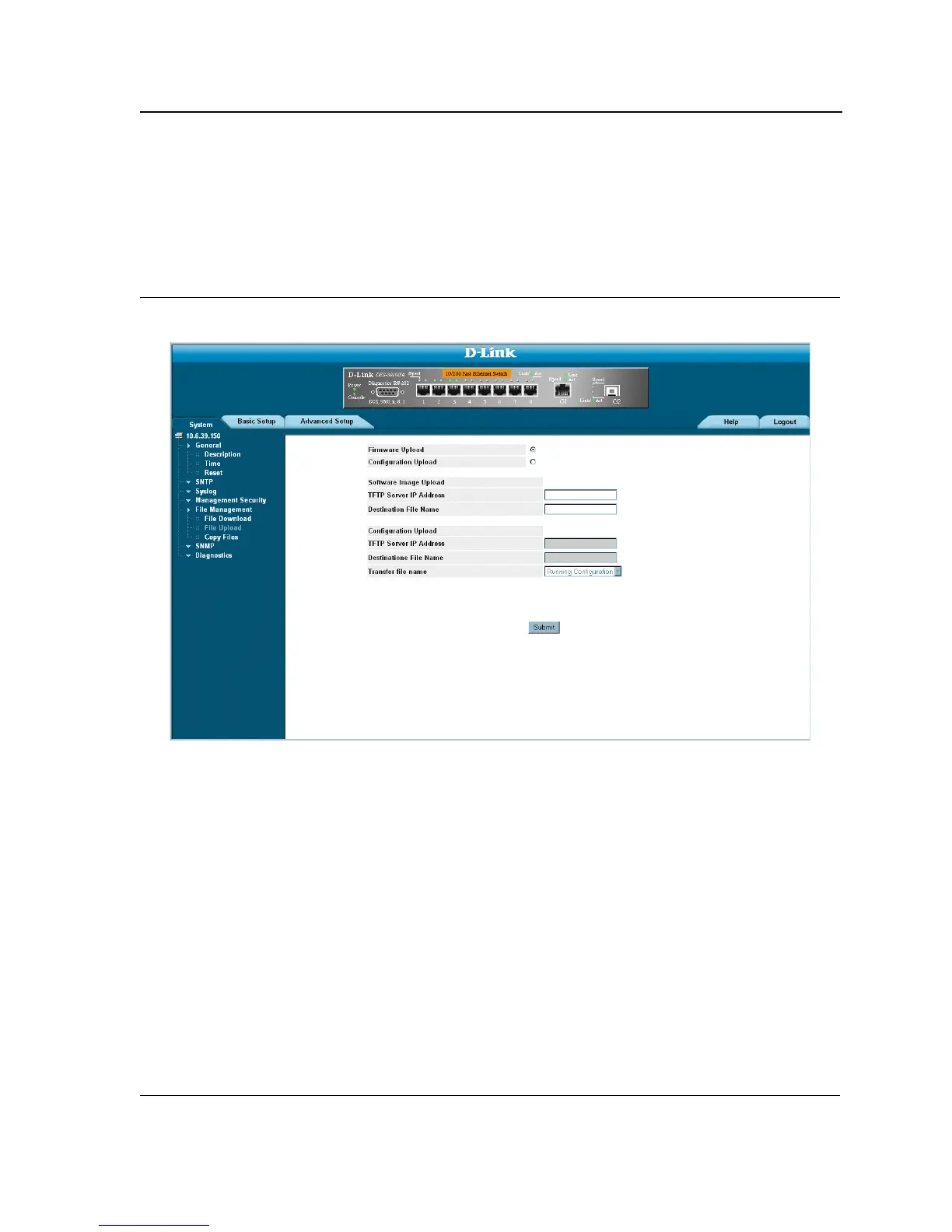 The File Upload Page contains fields for uploading the software from the device to the TFTP server. To upload a