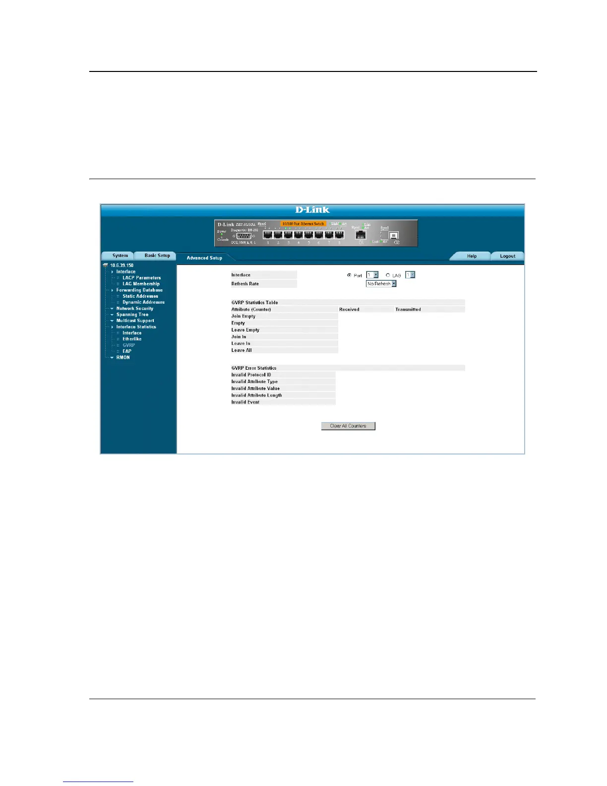 • Click Advanced Setup > Interface Statistics > GVRP. The GVRP Statistics Page opens.