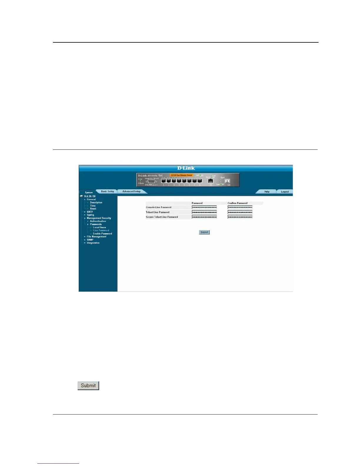 1. Click System > Management Security > Passwords > Line Password. The Line Password Page opens: