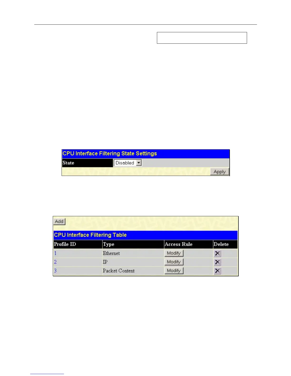 The CPU Interface Filtering Table displays the CPU Access Profile Table entries created on the Switch. To view the