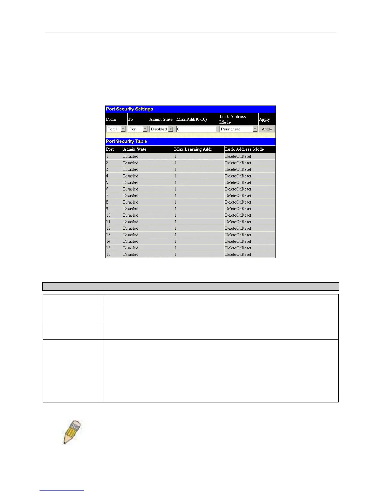 This pull-down menu allows you to enable or disable Port Security (locked MAC address