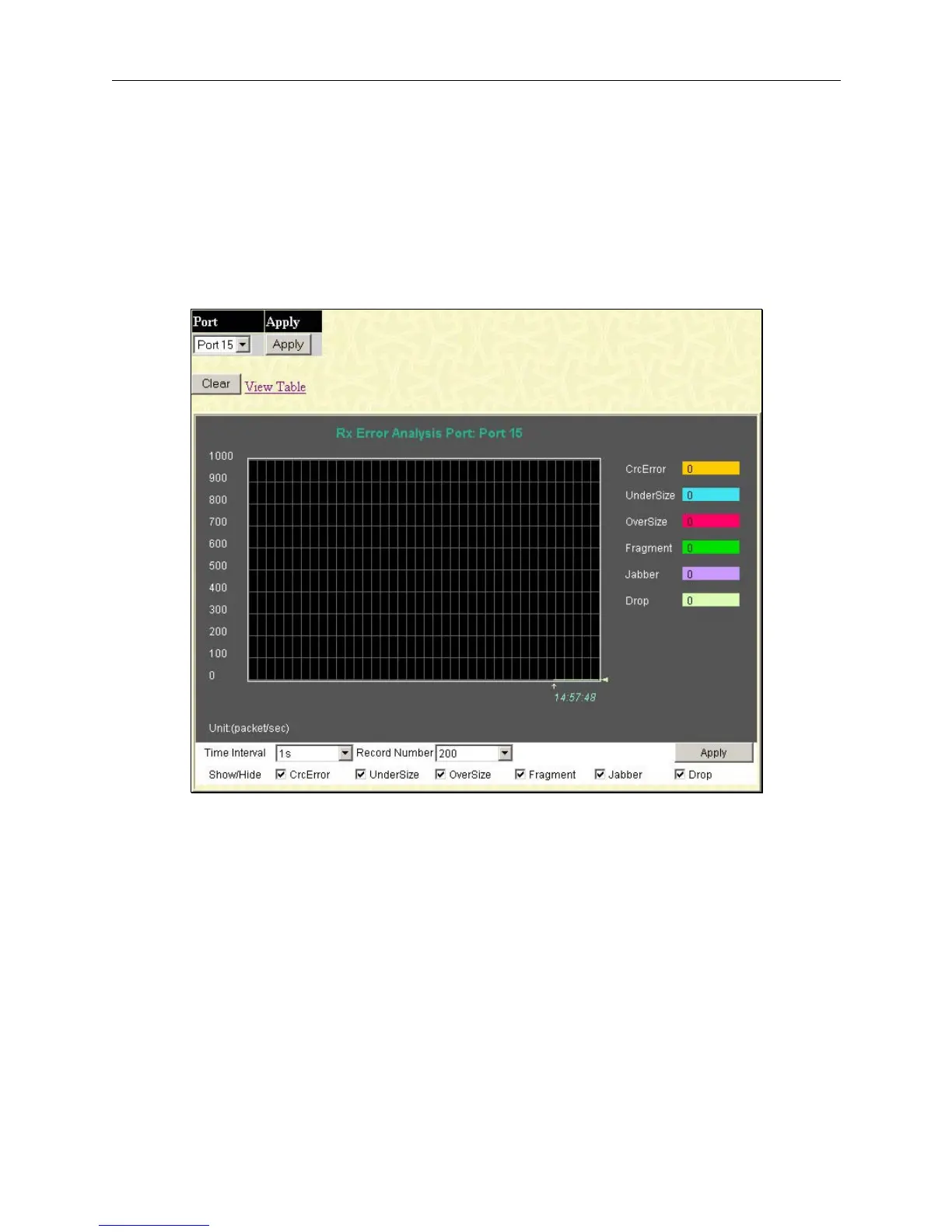 Click the Received (RX) link in the Error folder of the Monitoring menu to view the following graph of error packets