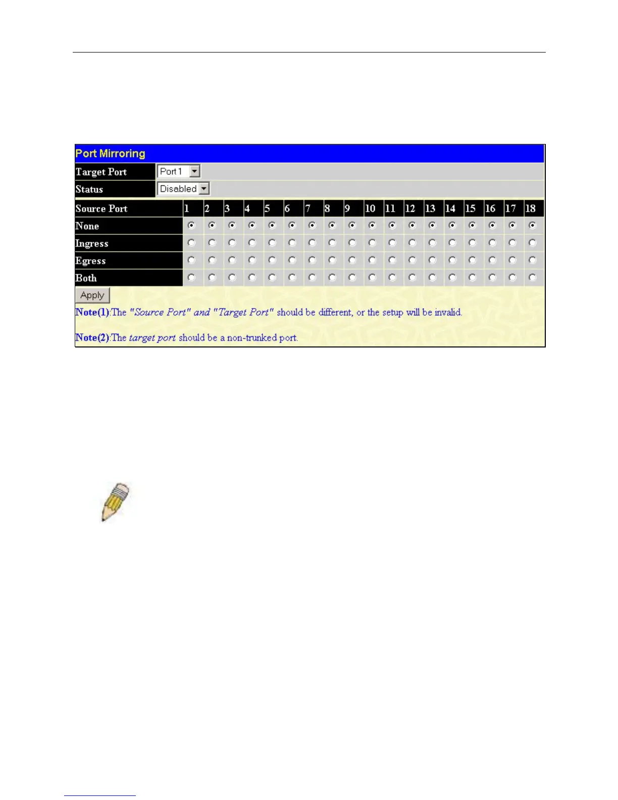 NOTE: You cannot mirror a fast port onto a slower port. For example, if you try to mirror