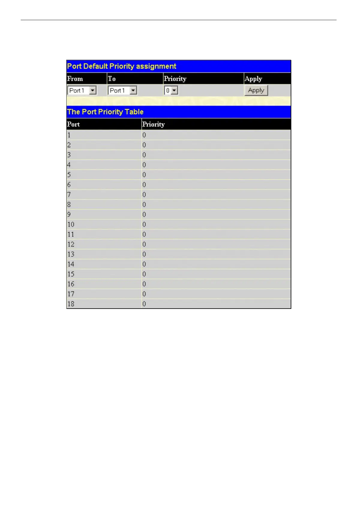This page allows you to assign a default 802.1p priority to any given port on the Switch. The priority tags are numbered from 0,