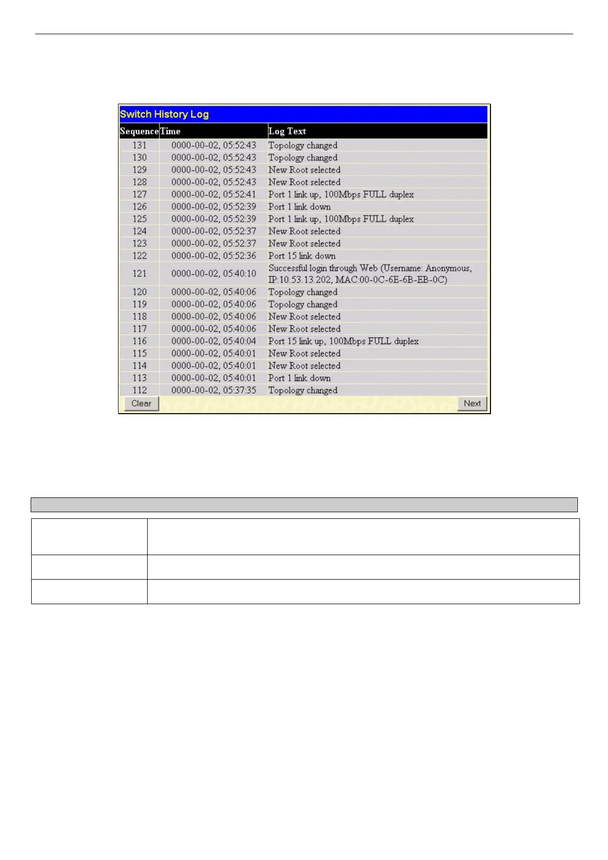 the console manager. Click Next to go to the next page of the Switch History Log. Clicking Clear will allow the user to clear the
