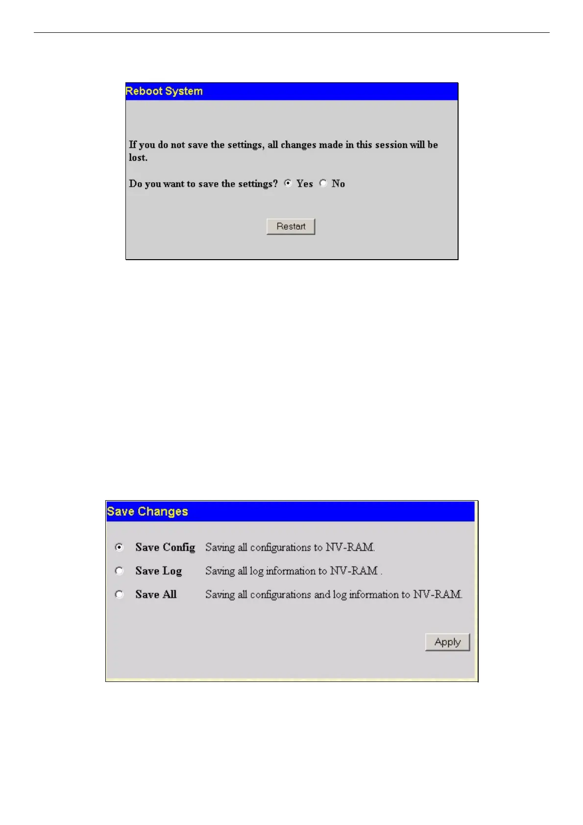 Clicking the Yes click-box will instruct the Switch to save the current configuration to non-volatile RAM before restarting the