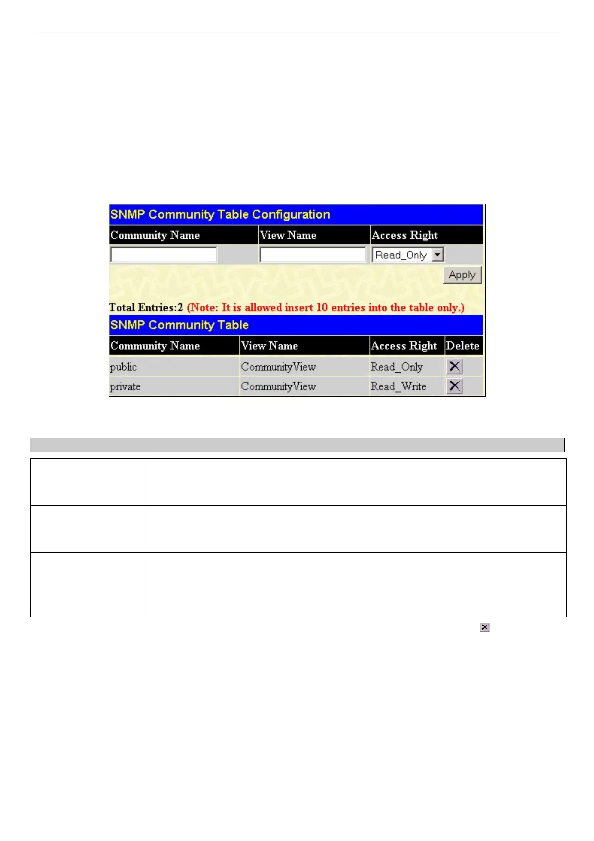 To implement the new settings, click Apply. To delete an entry from the SNMP Community Table, click the under the Delete