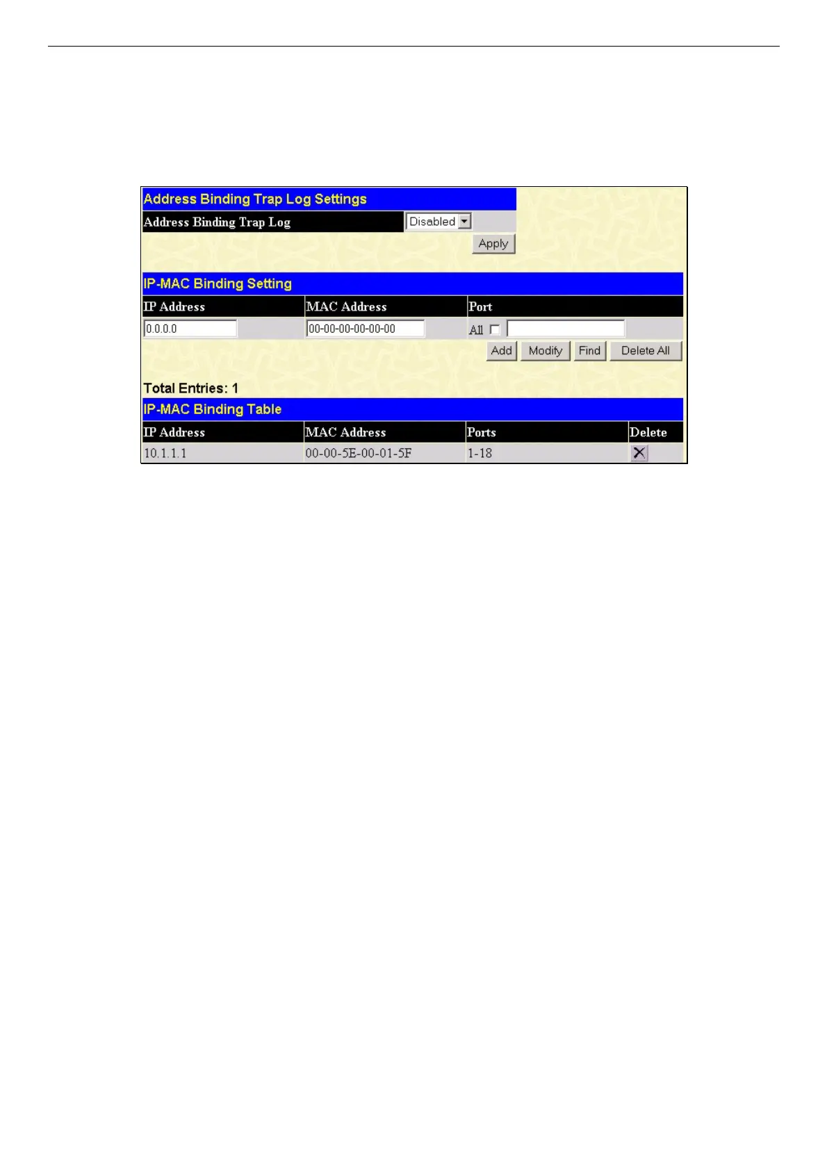 appropriate fields and click Add. To use IP-MAC binding checking on specific ports, the ports must first be enabled in the IP-