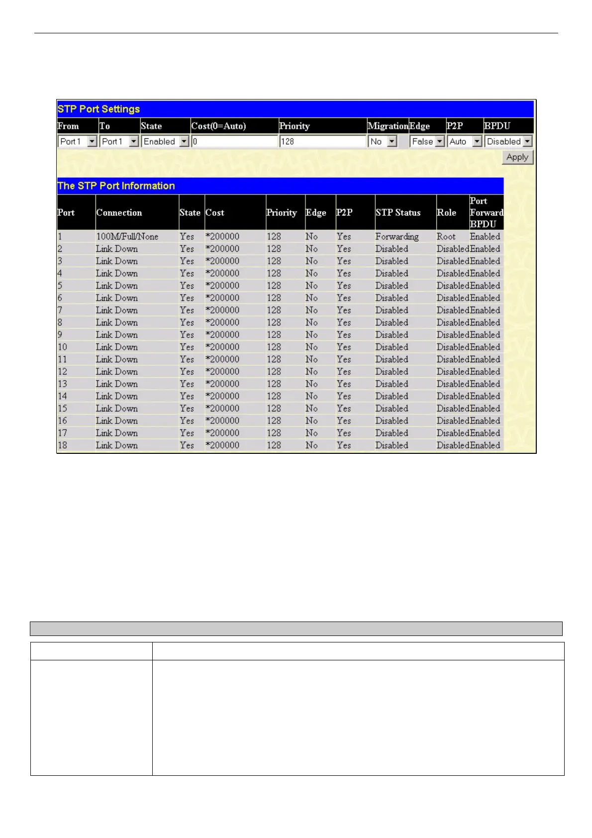 STP can be set up on a port per port basis. To view the following window click L2 Features > Spanning Tree > STP Port