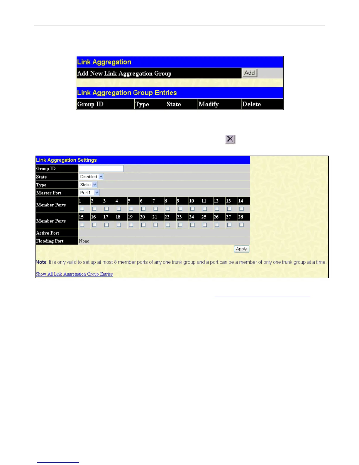 Aggregation Group Entries table (at the bottom of the Link Aggregation window).