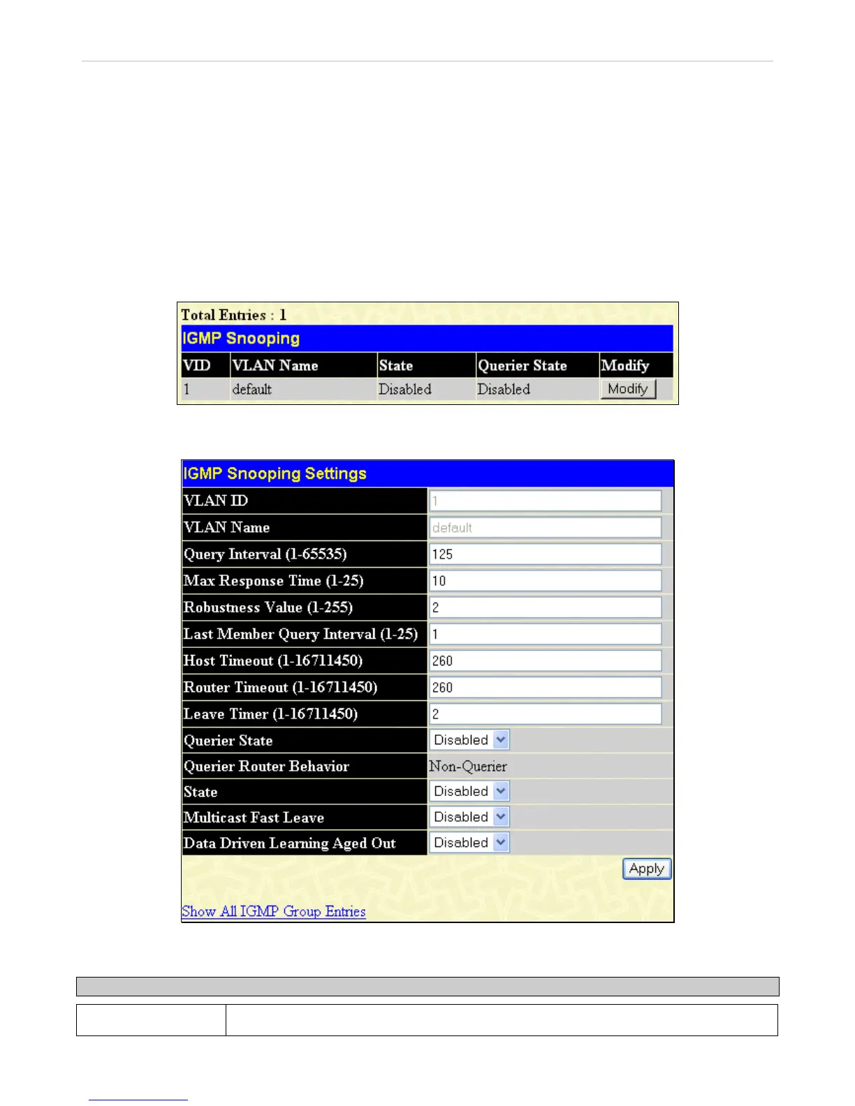 Use the IGMP Snooping window to view IGMP Snooping settings. To modify the settings, click the Modify button of the VLAN