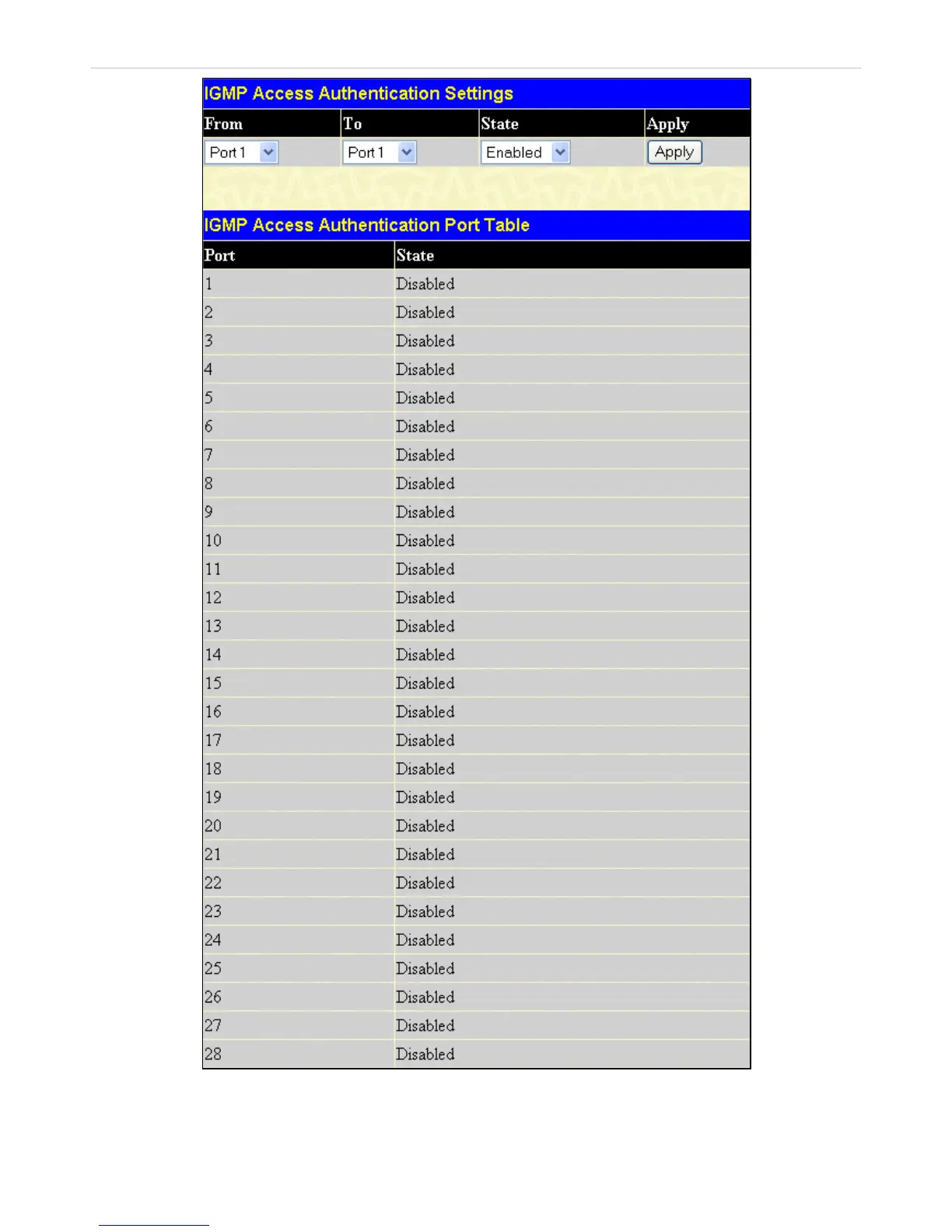 Select the range of ports you wish to Enable or Disable and click Apply to implement changes made.
