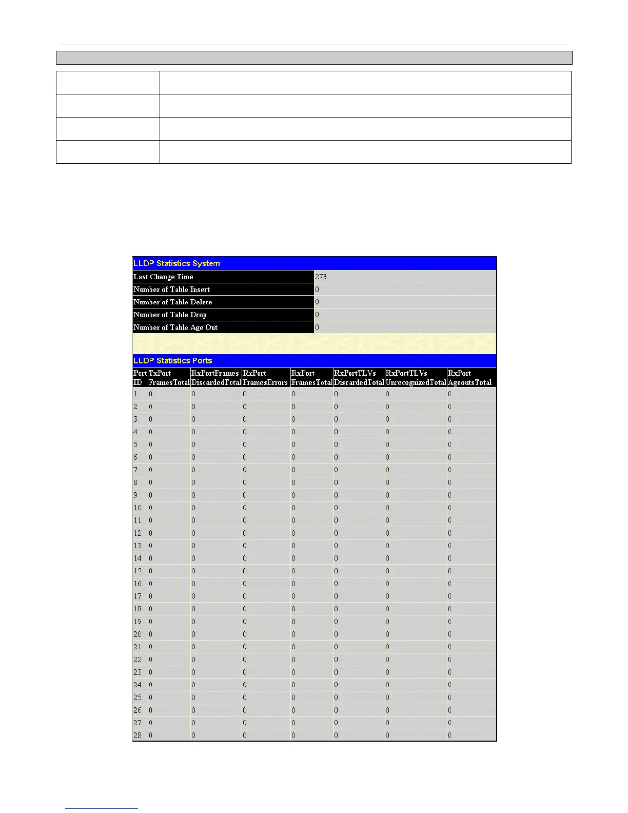 The following window is used to display LLDP statistics. To view this window click L2 Features > LLDP > LLDP Statistics.