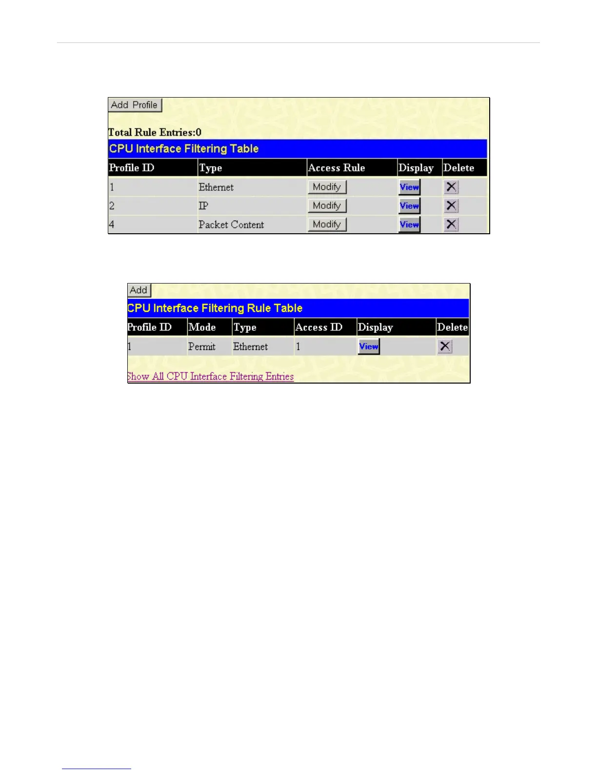 Click ACL > CPU Interface Filtering > CPU Interface Filtering Profile Table.