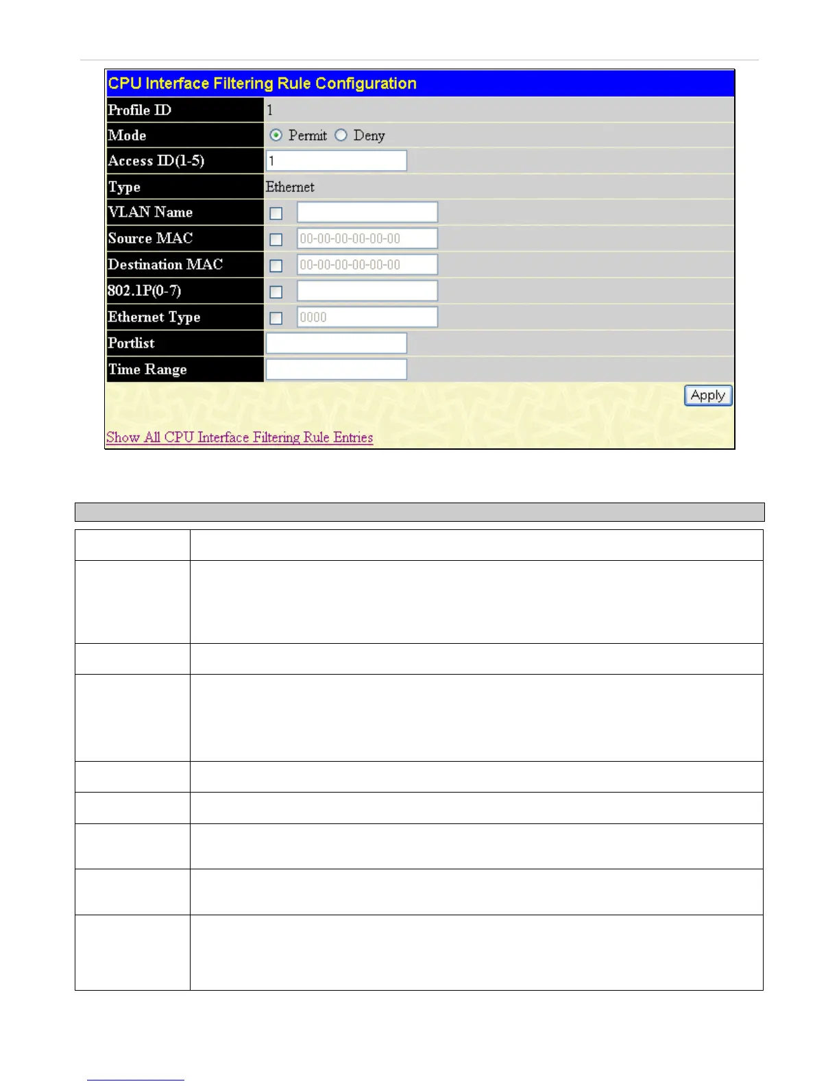 To set the CPU Access Rule for Ethernet, adjust the following parameters and click Apply.