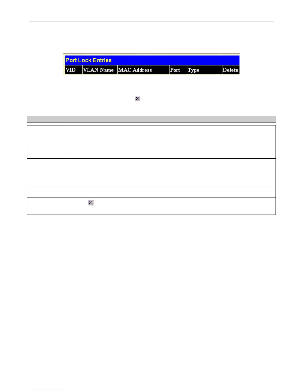The Port Lock Entries Table window is used to remove an entry from the port security entries learned by the Switch and entered