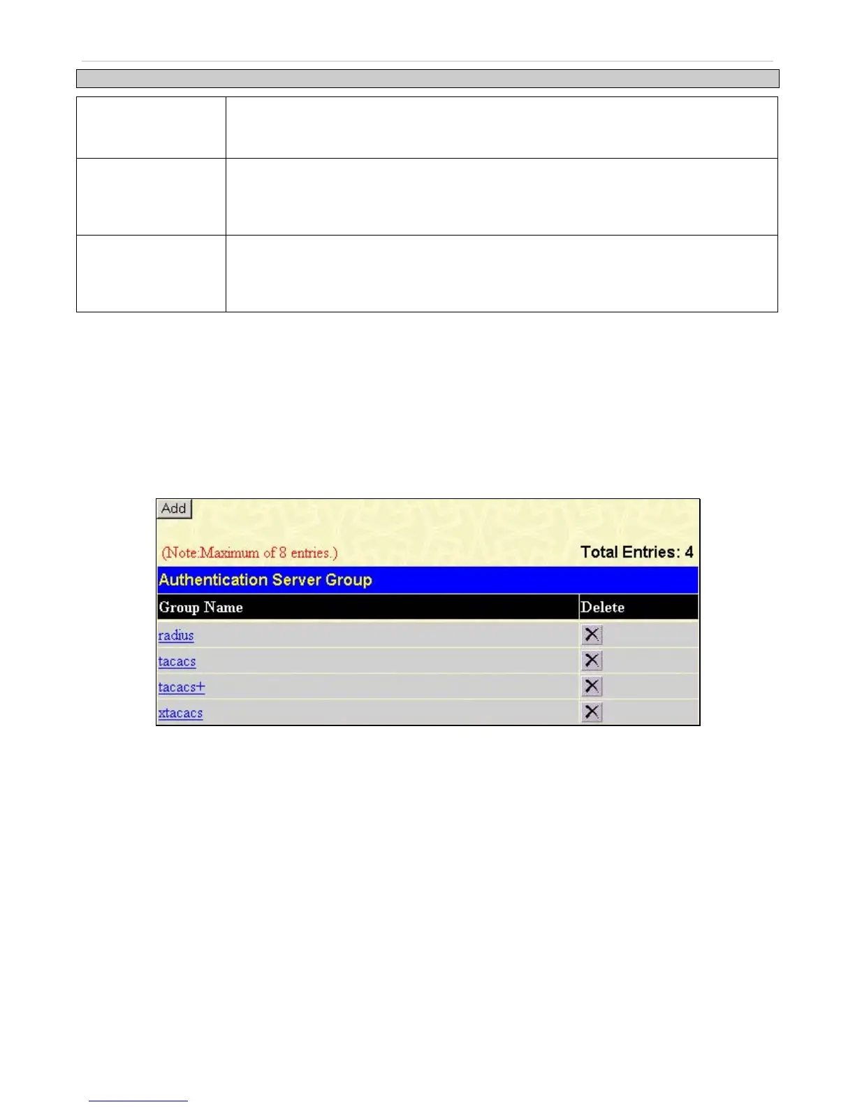 This window displays the Authentication Server Groups on the Switch. To modify a particular group, click its hyperlinked Group