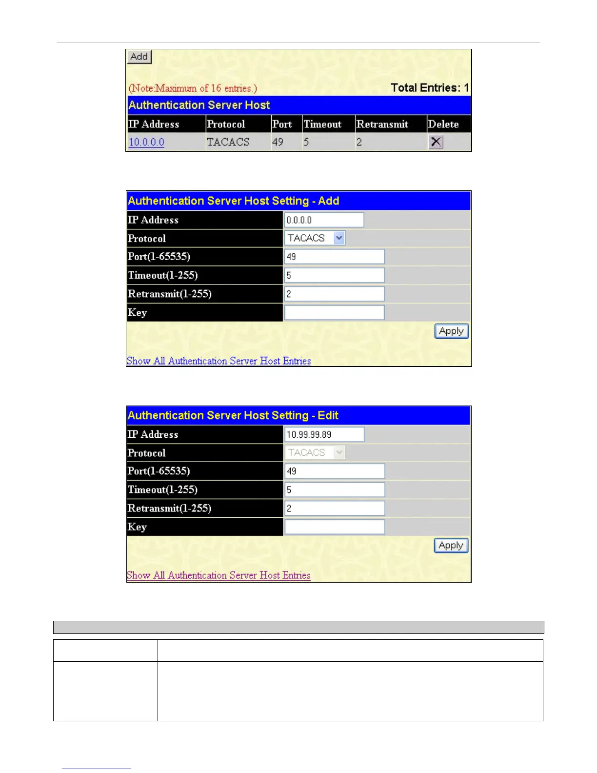 To edit an Authentication Server Host, click the IP address hyperlink, revealing the following window: