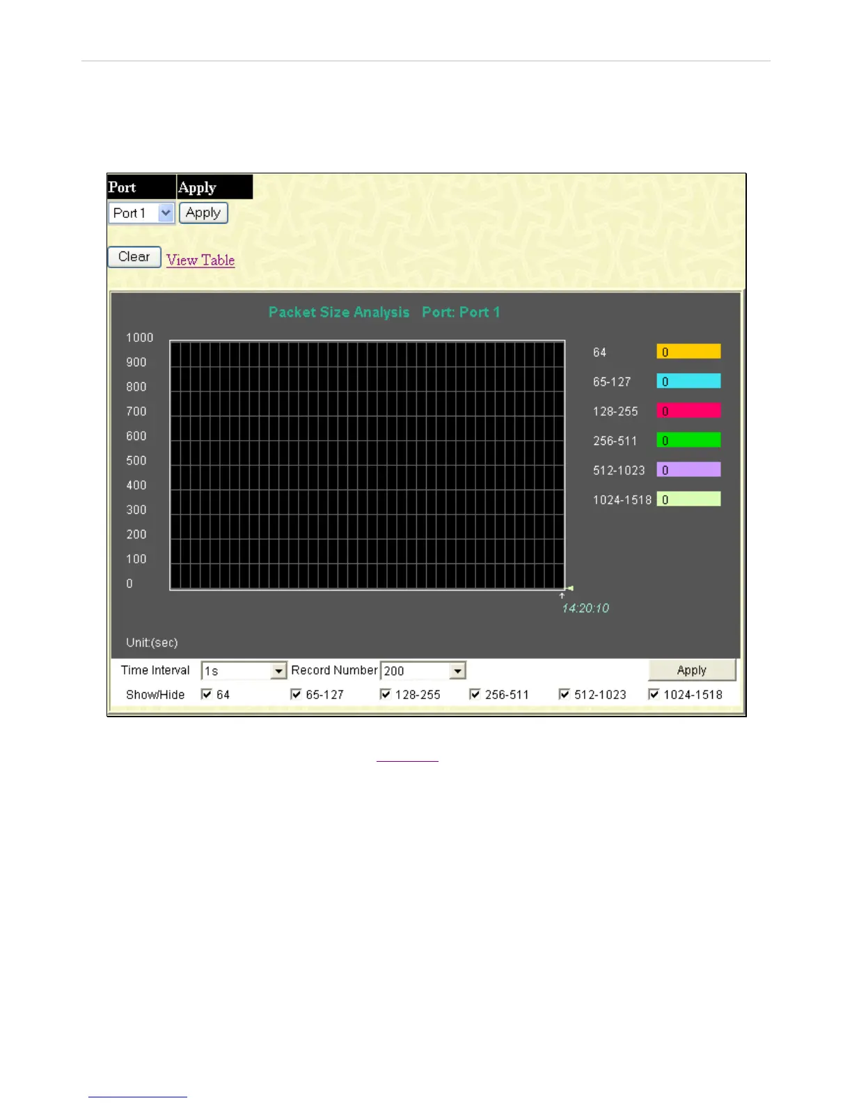 The Web Manager allows packets received by the Switch, arranged in six groups and classed by size, to be viewed as either a line
