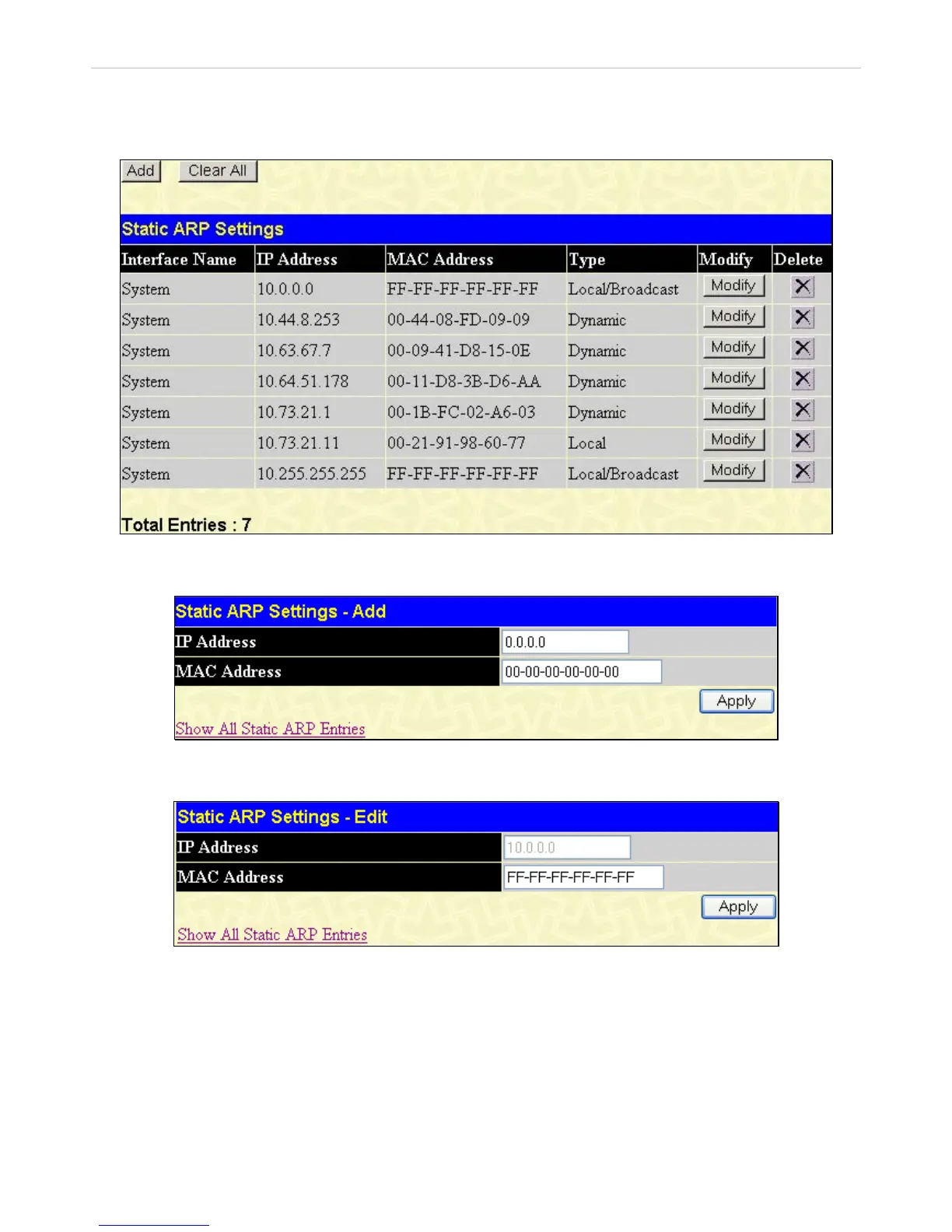 This window will show current ARP entries on the Switch. To clear the ARP Table, click Clear All. To view this window click