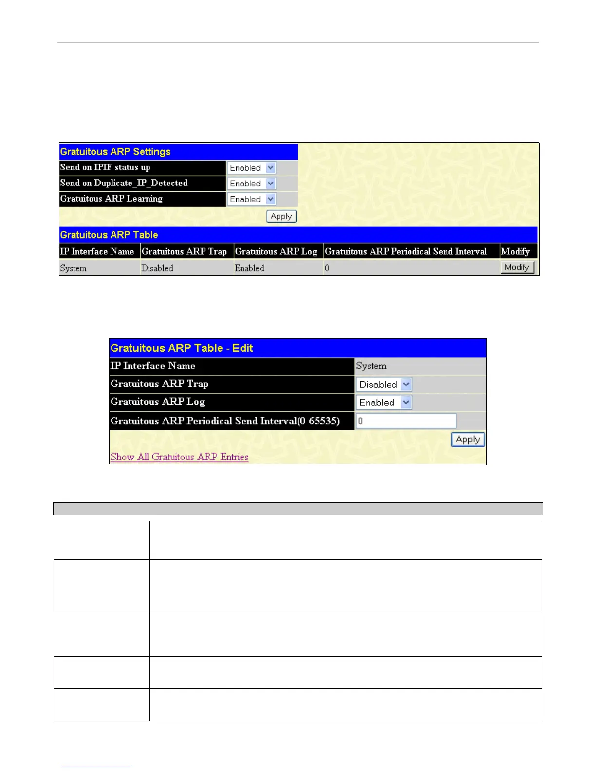 This window will show the Gratuitous ARP Settings on the Switch. An ARP announcement (also known as Gratuitous ARP) is a