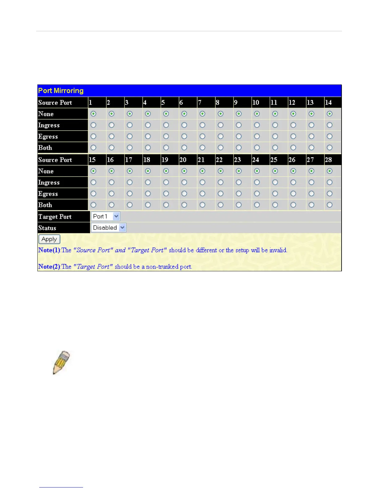 first port. This is useful for network monitoring and troubleshooting purposes. To view the Port Mirroring window, click