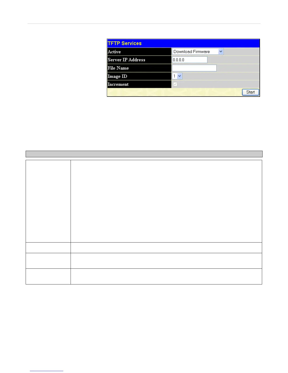 location of the new firmware on the TFTP server. Click Start to record the IP