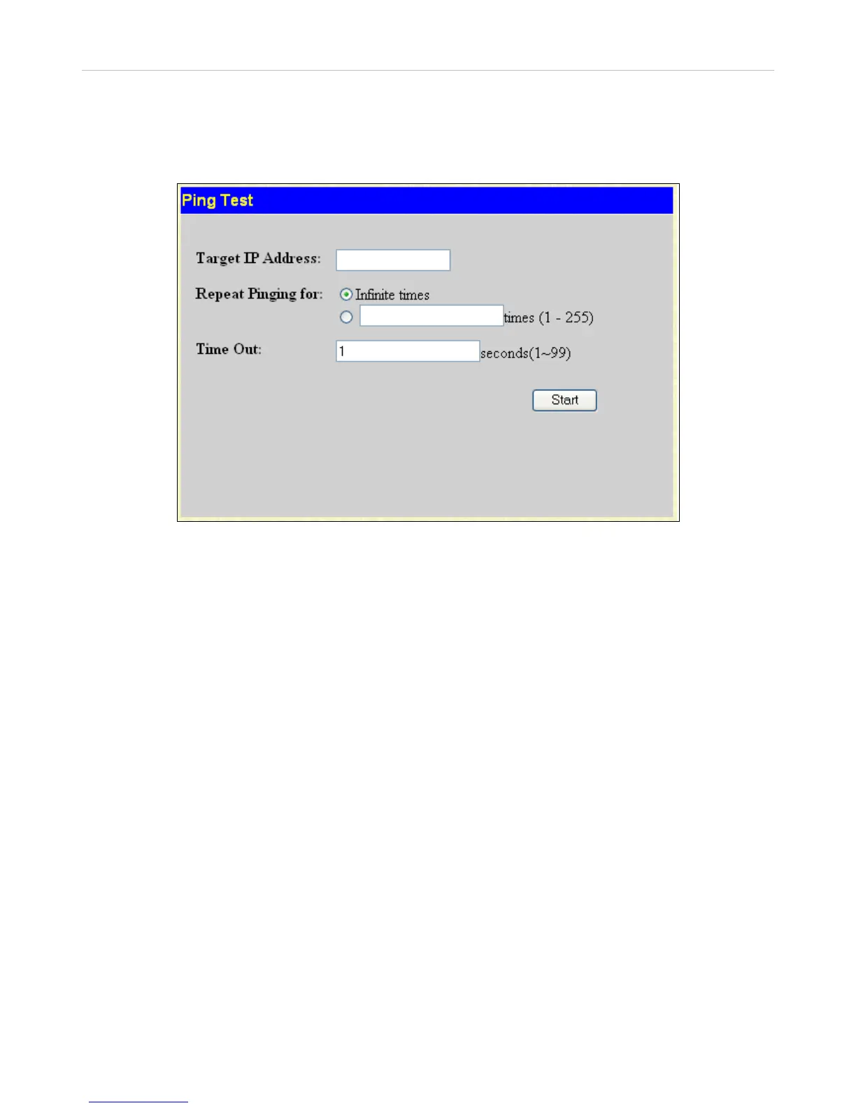 times to ping the Target IP Address by clicking its radio button and entering a number between 1 and 255. Click Start to initiate